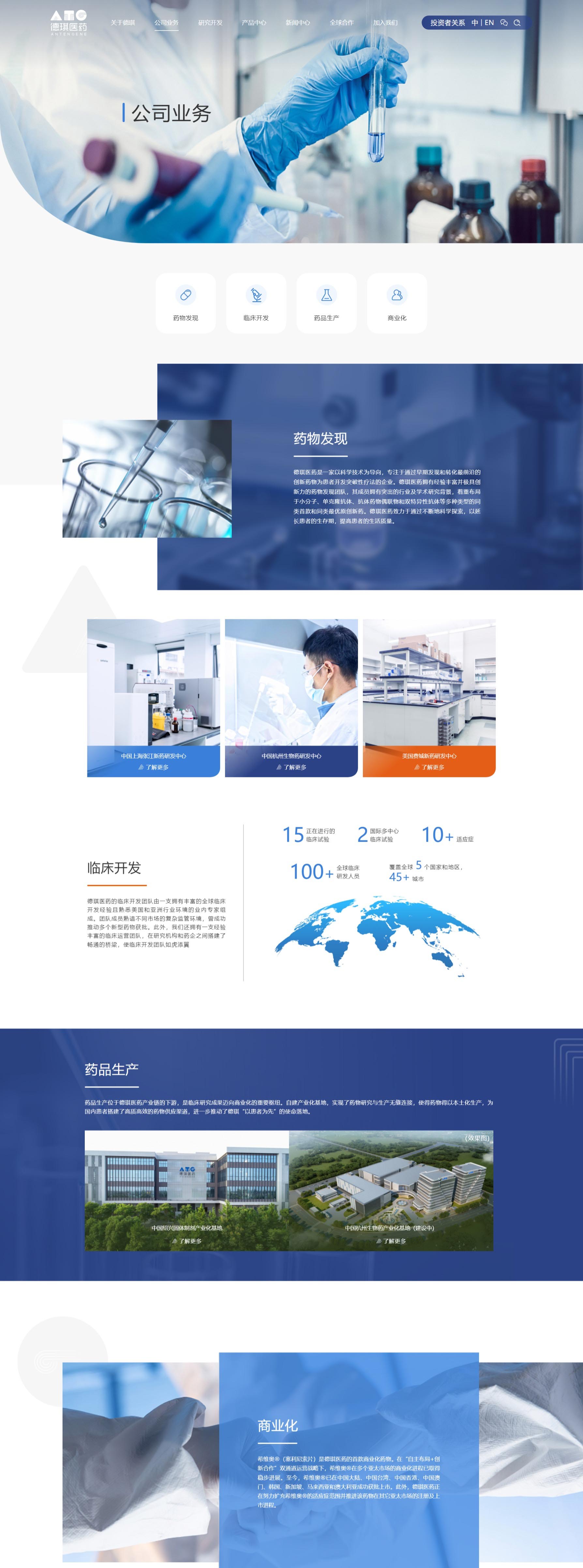 德琪醫藥網站選用科技藍為主色調,搭配銀色、白色與少量的橙色,營造出專業、創新且充滿活力的科研氛圍。科技藍展現出公司在生物醫藥領域的深邃探索與專業精神,如同對未知的無盡追求。銀色作為輔助,平衡了整體色調,增添了未來感與科技質感,使頁麵更具和諧美感。白色則用於突出關鍵信息,提升了內容的清晰度和可讀性,讓用戶能夠輕鬆獲取重要資訊。