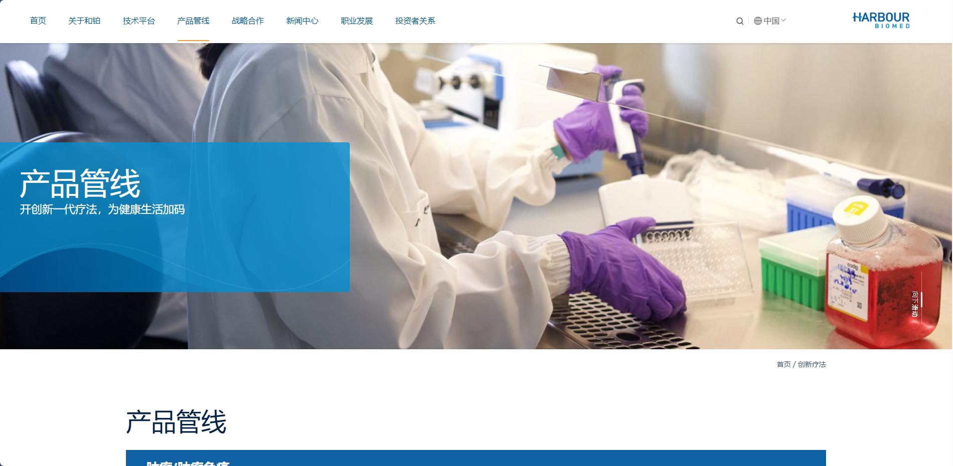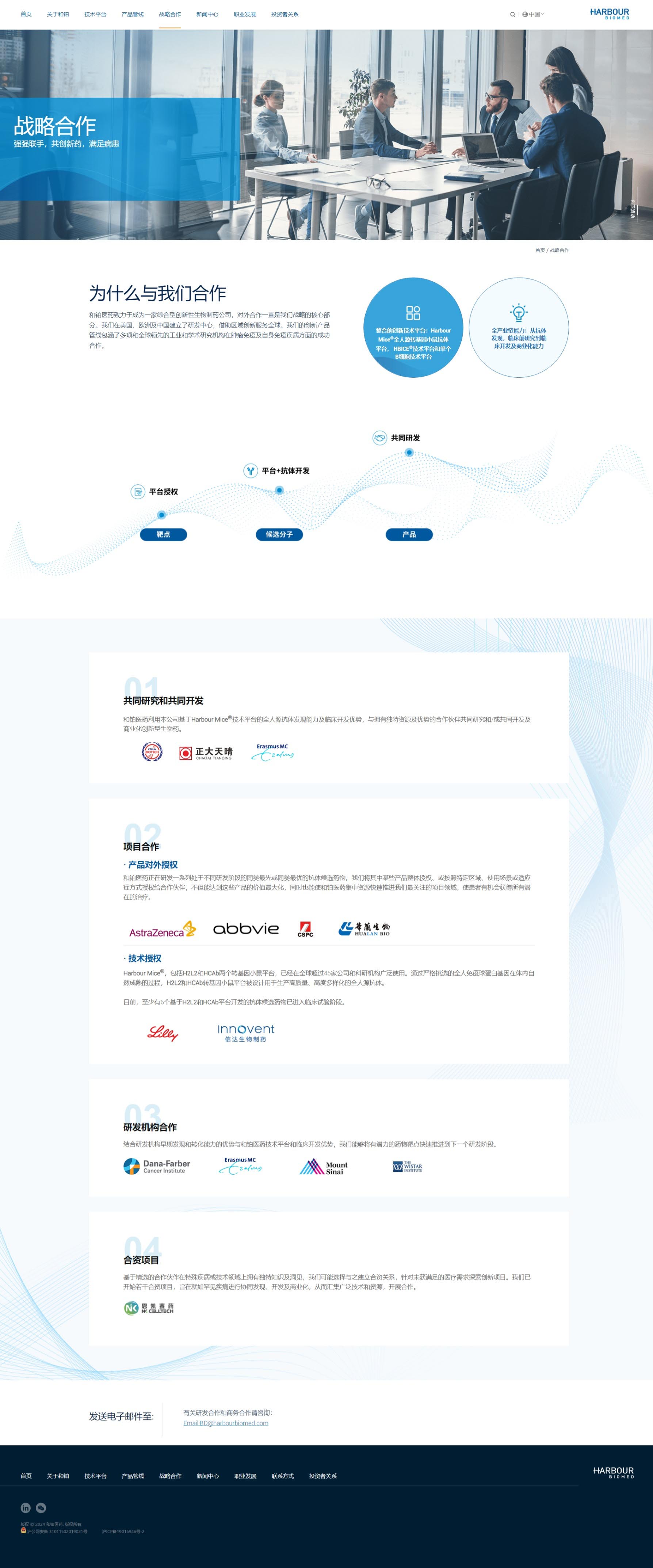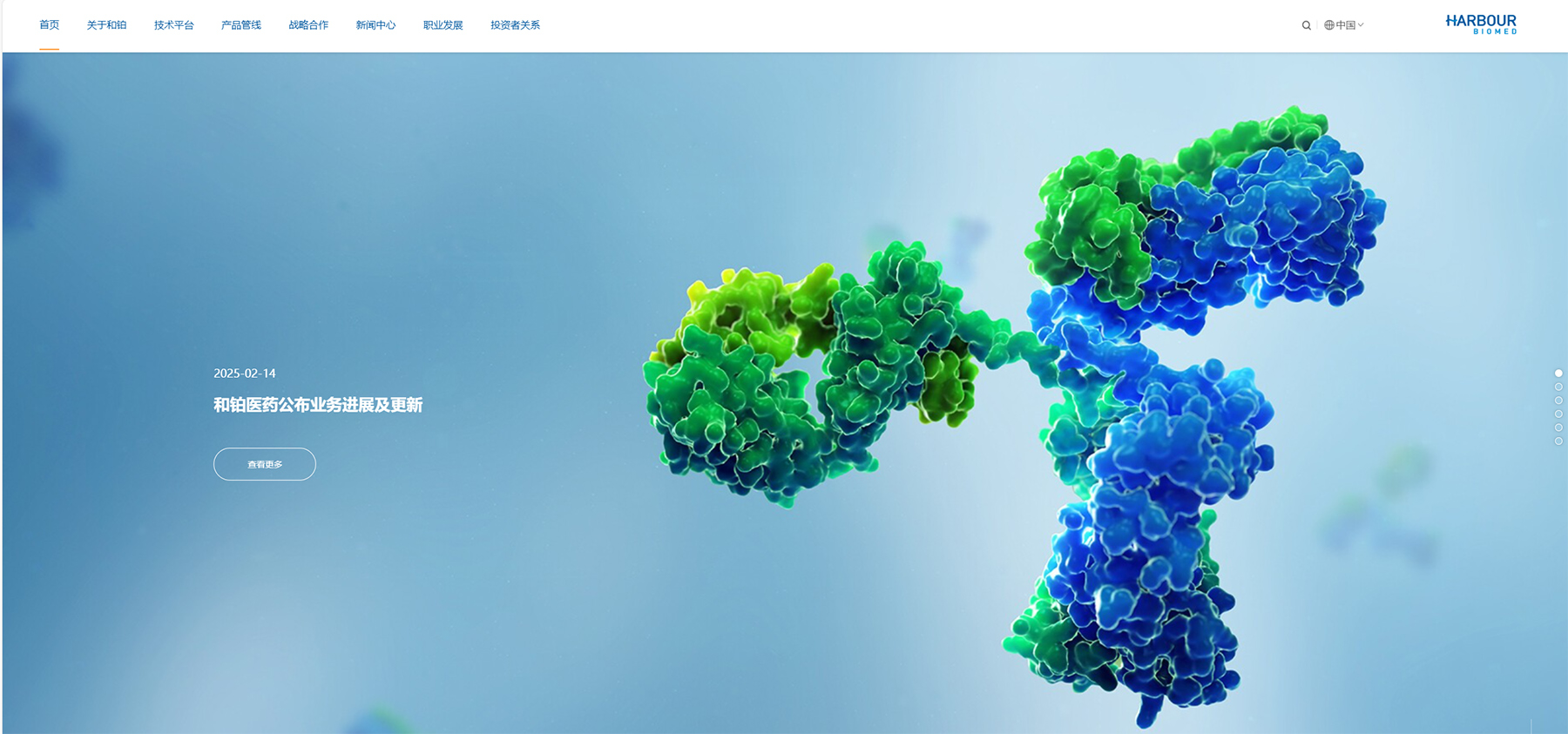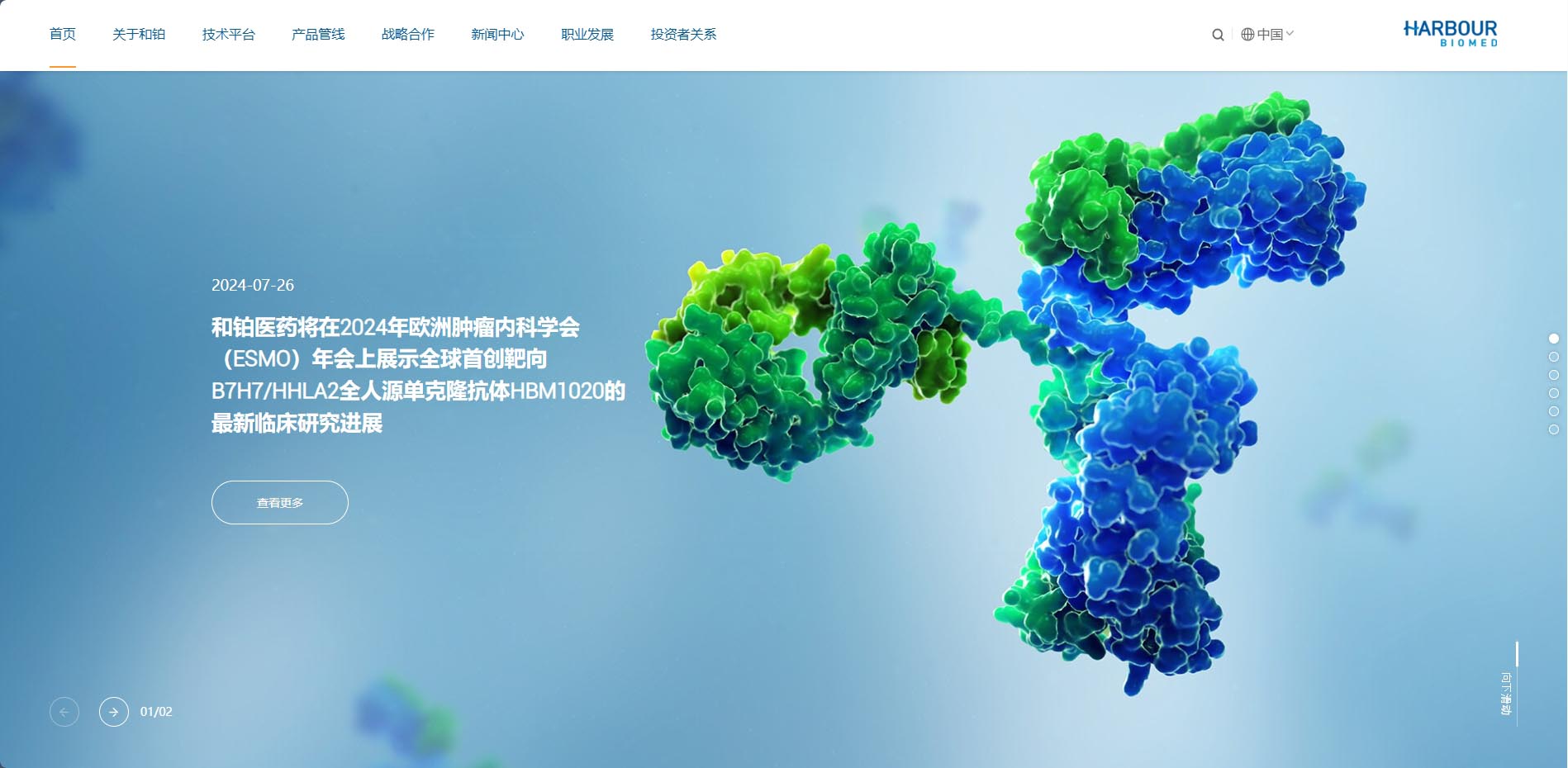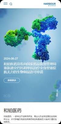 和鉑醫藥網站以藍色作為主色調,搭配白色和灰色等中性色。藍色給人專業、穩重、科技感十足的印象,與和鉑醫藥在生物製藥領域的專業形象相契合,白色主要作為背景色,使整個頁麵顯得幹淨、整潔,為用戶提供了清晰的視覺環境,同時也能夠突出藍色係的主體內容,提高頁麵的可讀性和視覺舒適度。