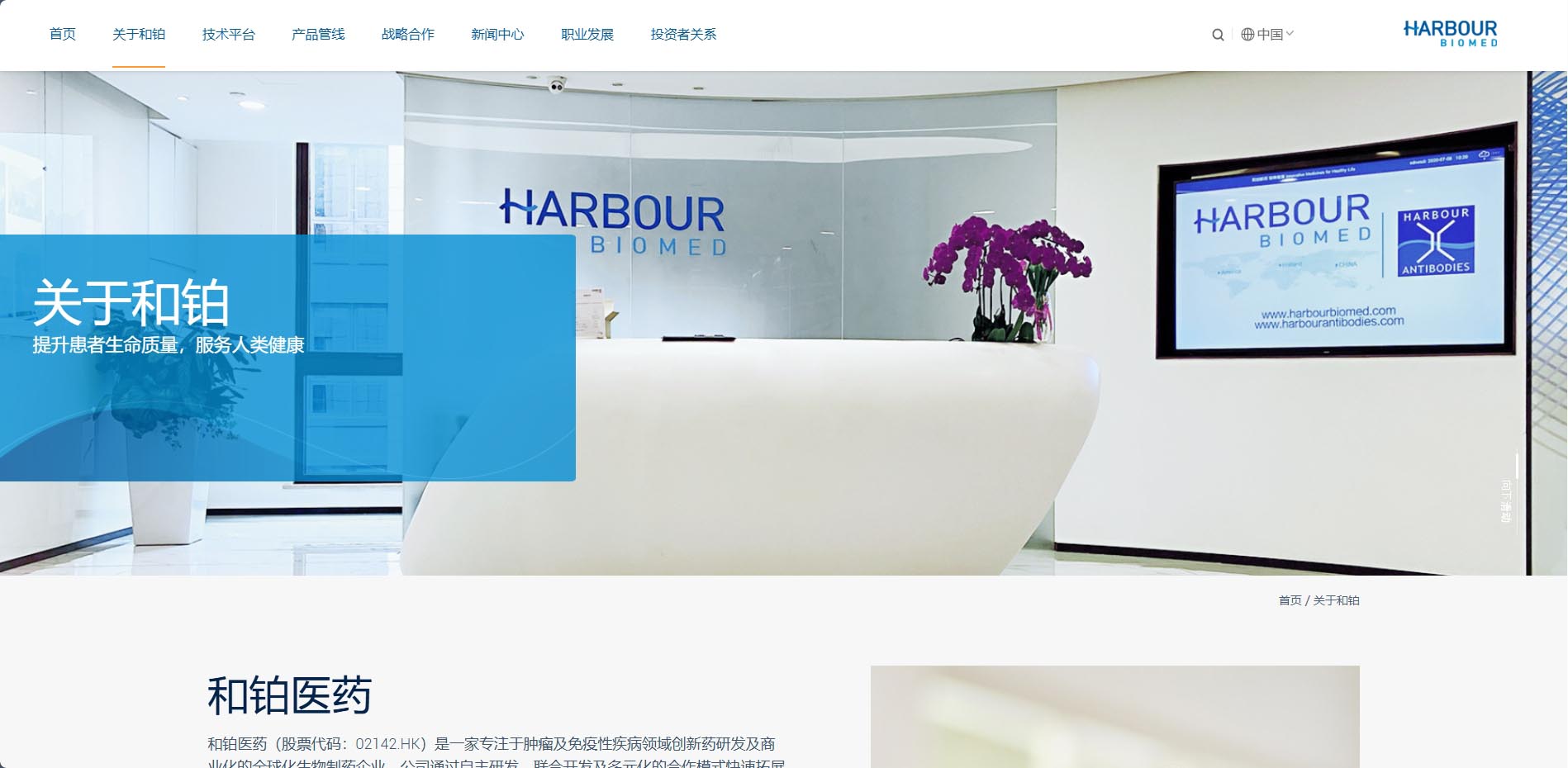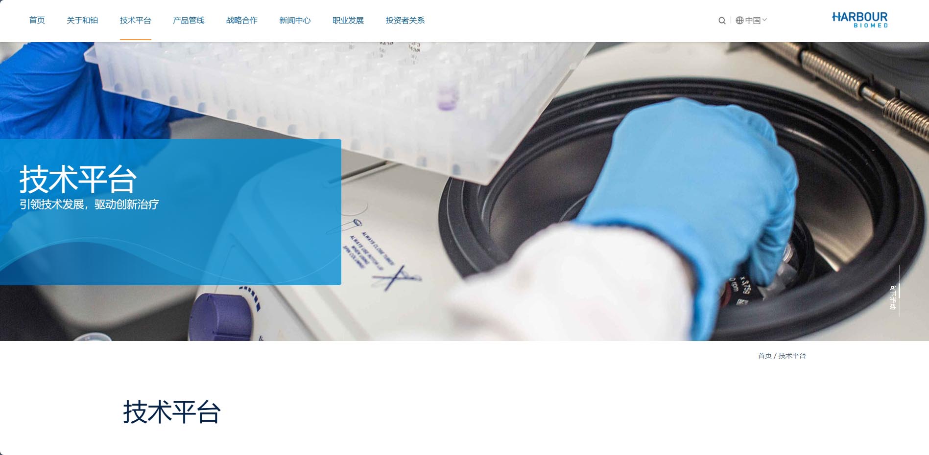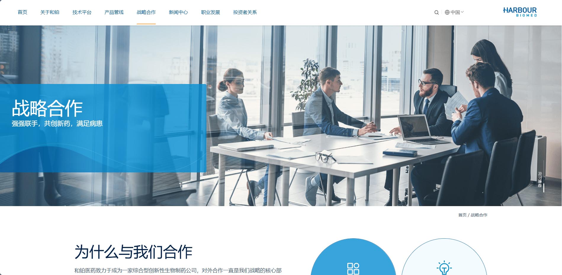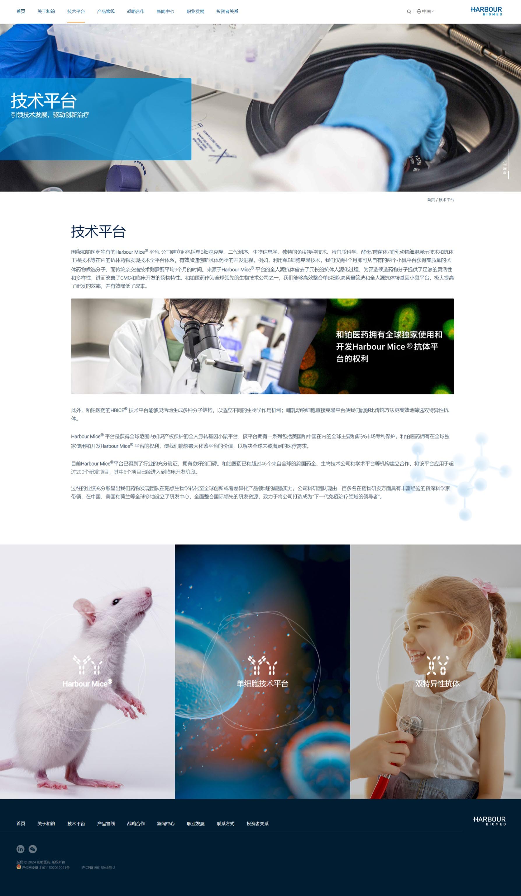 和鉑醫藥網站以藍色作為主色調,搭配白色和灰色等中性色。藍色給人專業、穩重、科技感十足的印象,與和鉑醫藥在生物製藥領域的專業形象相契合,白色主要作為背景色,使整個頁麵顯得幹淨、整潔,為用戶提供了清晰的視覺環境,同時也能夠突出藍色係的主體內容,提高頁麵的可讀性和視覺舒適度。