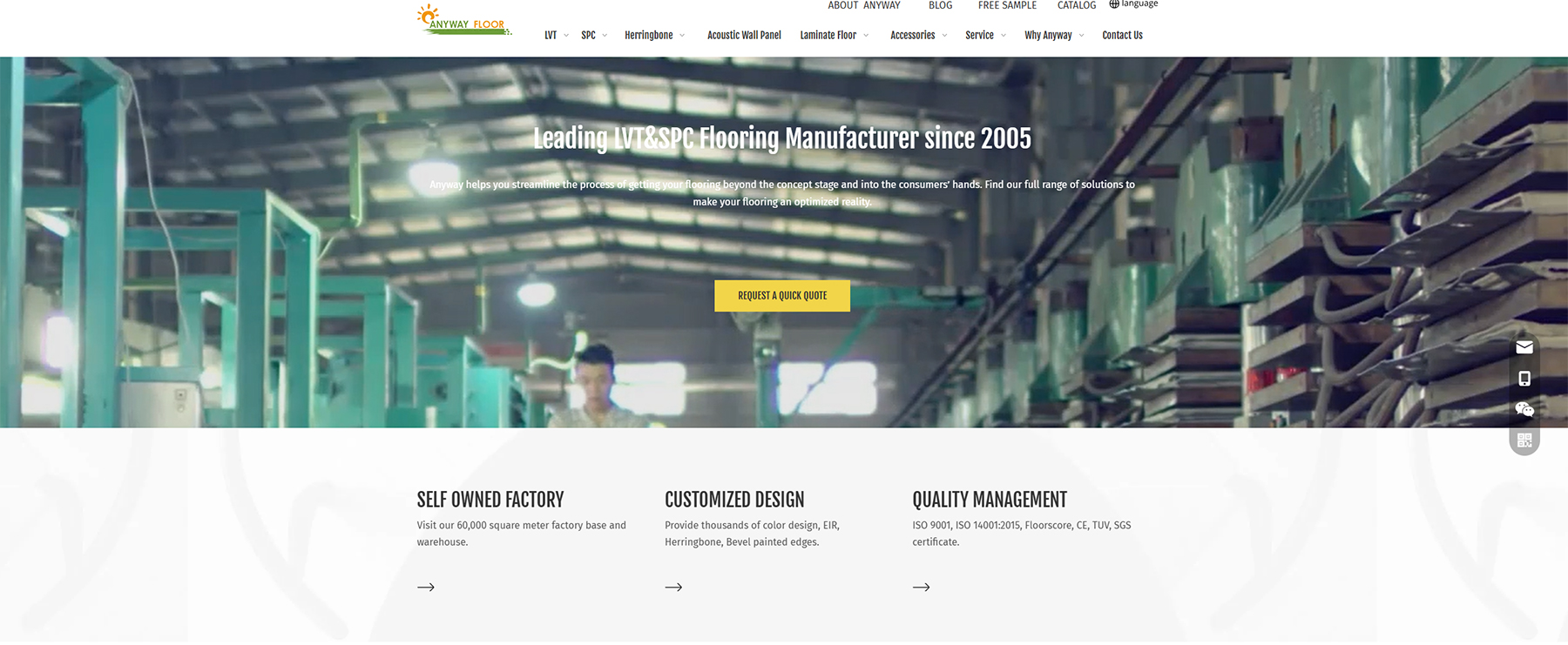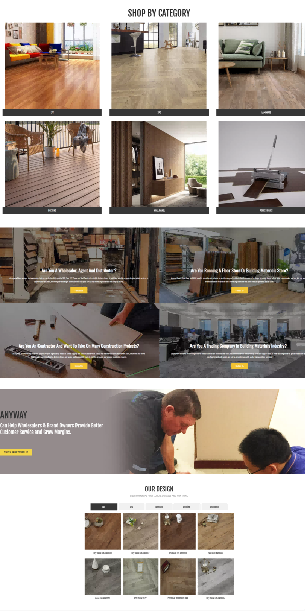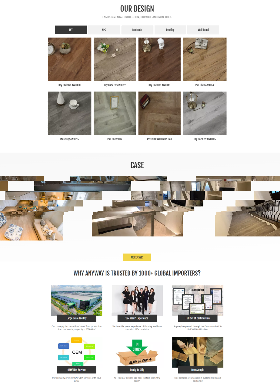 網站旨在全麵展示 Anyway 豐富的地板及相關產品係列,如 LVT、SPC、 laminate、decking、wall panel 等,突出其生產規模、定製能力和質量認證優勢。為不同類型客戶(批發商、零售商、承包商、貿易公司)提供針對性的服務介紹,吸引客戶合作,並通過新聞資訊和案例分享傳遞行業知識,樹立專業品牌形象,促進產品銷售與市場拓展。