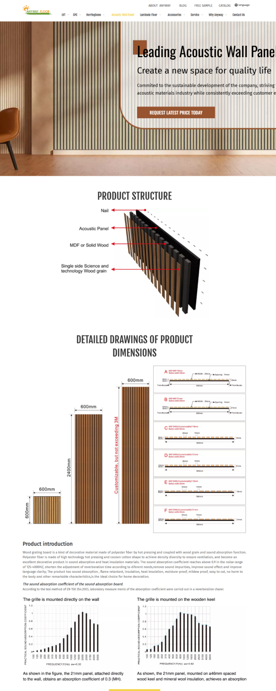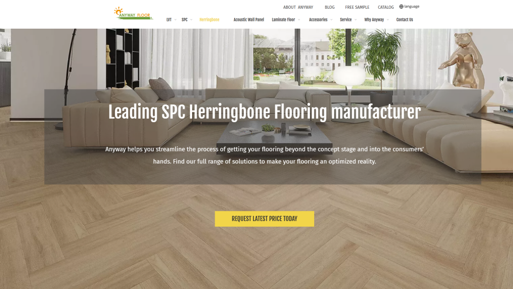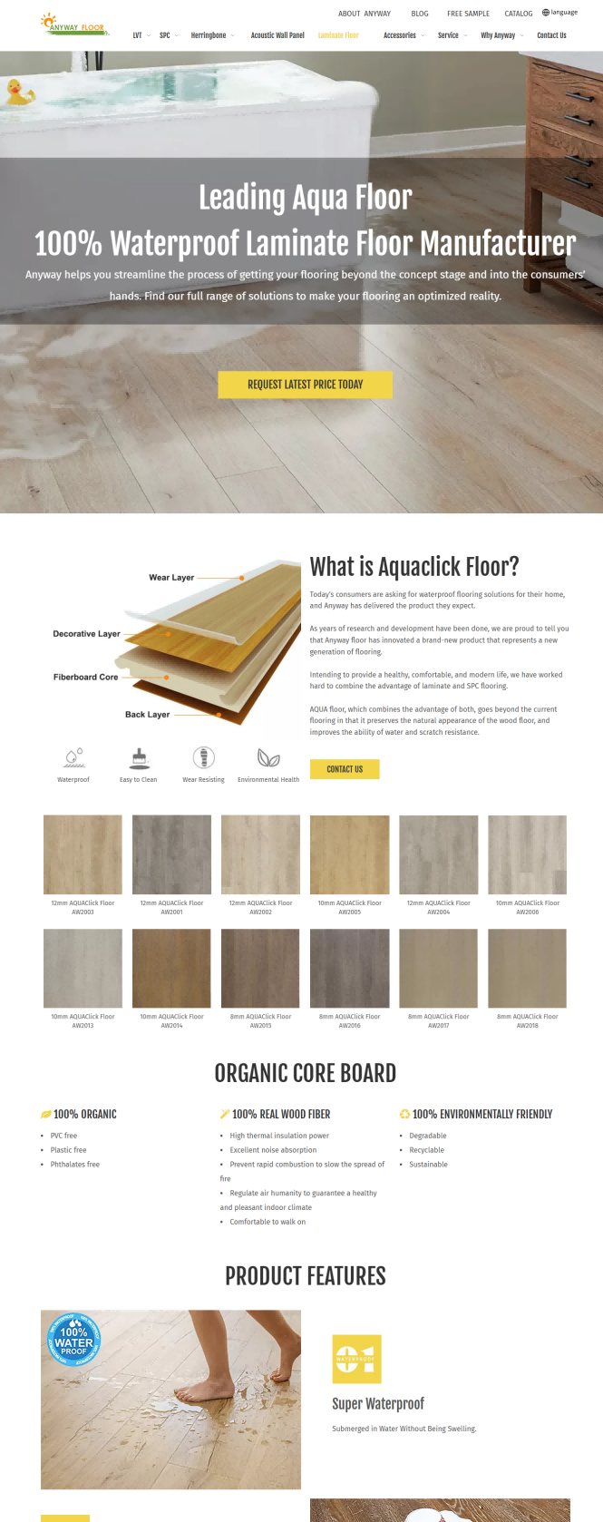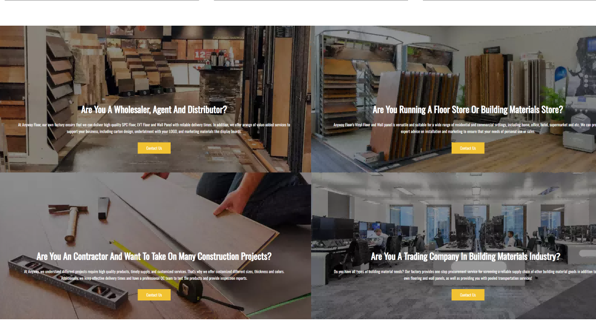 網站旨在全麵展示 Anyway 豐富的地板及相關產品係列,如 LVT、SPC、 laminate、decking、wall panel 等,突出其生產規模、定製能力和質量認證優勢。為不同類型客戶(批發商、零售商、承包商、貿易公司)提供針對性的服務介紹,吸引客戶合作,並通過新聞資訊和案例分享傳遞行業知識,樹立專業品牌形象,促進產品銷售與市場拓展。