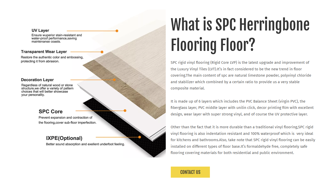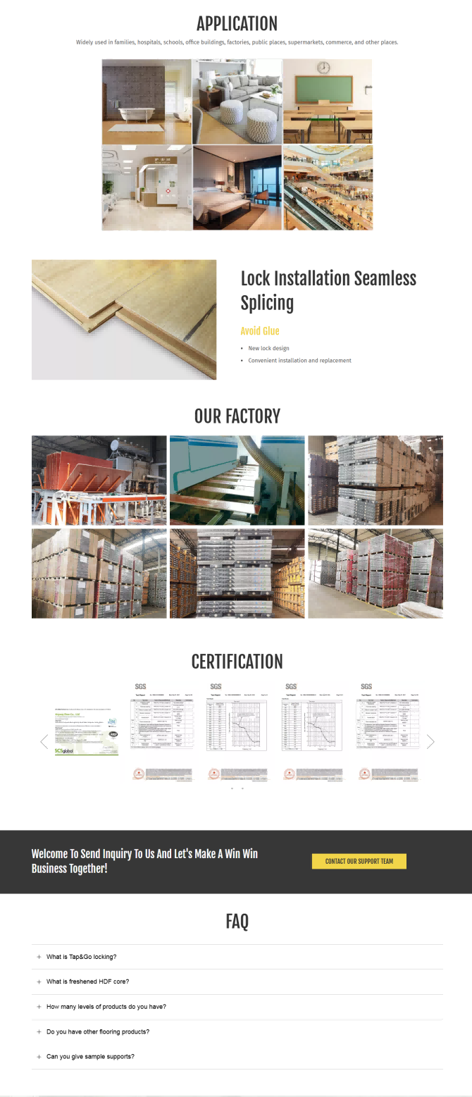 網站以白色為背景主色調,營造出簡潔、明亮的視覺空間,使產品圖片和文字信息清晰呈現。產品分類導航及按鈕采用黃色進行區分,增強了頁麵的層次感與專業性。在產品展示部分,地板和牆板的真實色彩得以精準還原,吸引用戶關注細節,整體色彩搭配協調統一,符合行業特性與用戶瀏覽習慣。